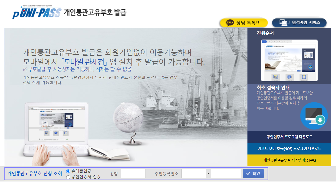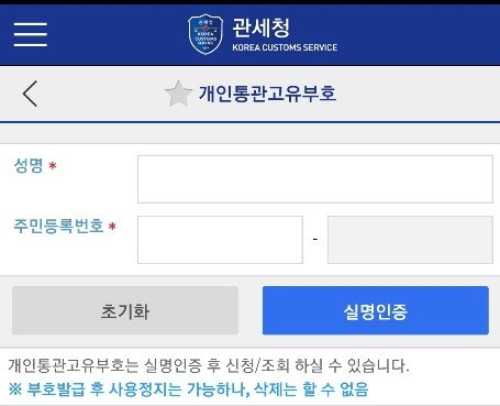 예전에는 관세청 개인물품신고시 본인인증을 위해 주민등록번호를 사용하였지만, 개인정보유출의 우려때문에 개인통관고유부호로 대체하게 되었어요 :)