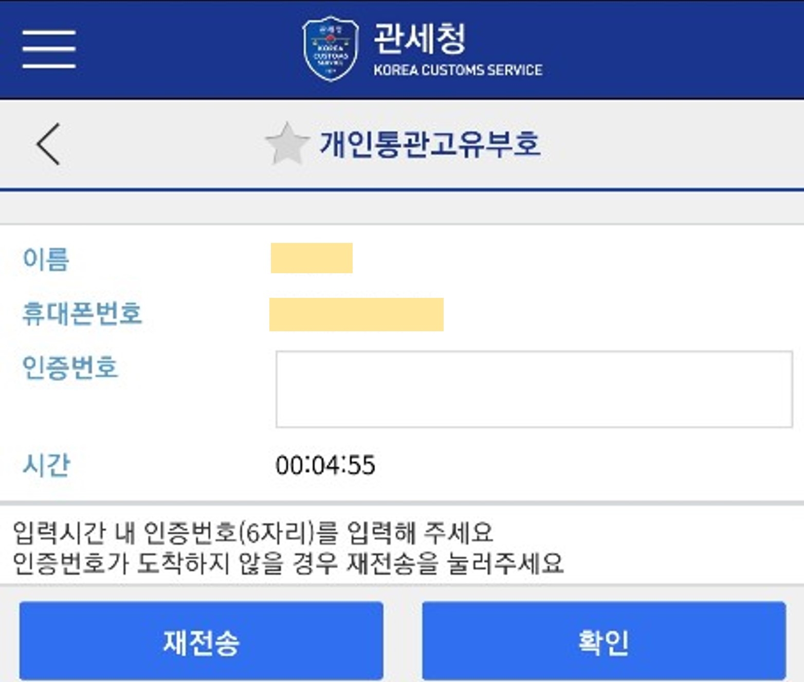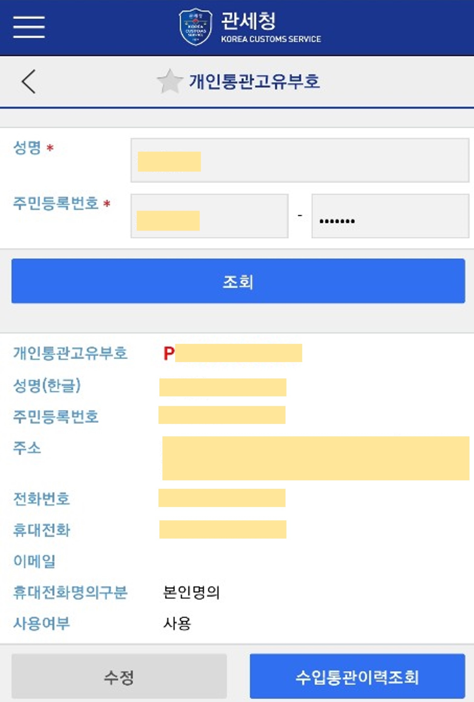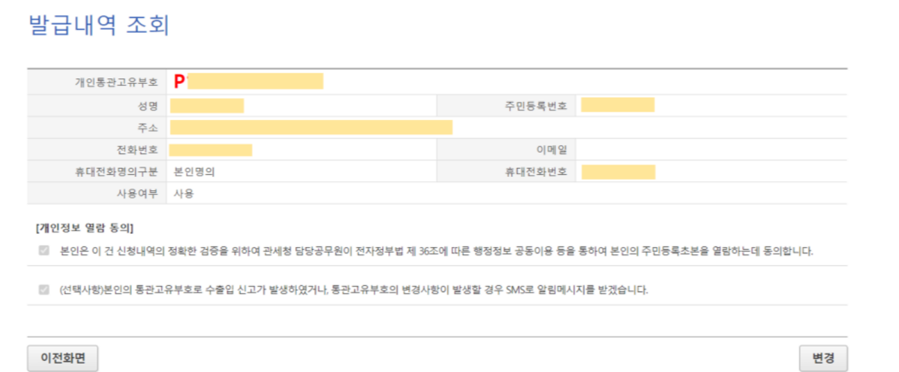 만약 개인정보 변동사항(주소, 연락처 외)이 있을시, 관세청에서 수정하면 됩니다.